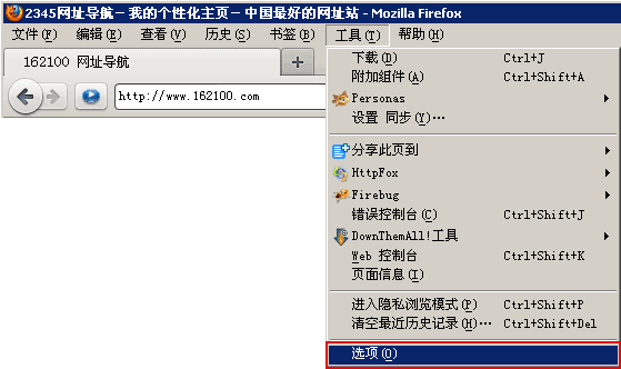 火狐(Firefox)浏览器设置主页的方法: 1)首先,打开浏览器上部菜单栏的“工具”栏,在下拉列表中选择“选项”,如下图所示: