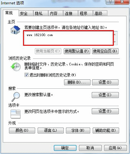 2)然后在打开的对话窗口中的主页栏的地址输入框中输入“http://www.4x5y.com/”,然后点击窗口上方的“应用”按扭即可,如下图所示: