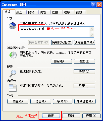 然后在打开的对话窗口中的主页栏的地址输入框中输入“http://www.4x5y.com/”,然后点击窗口下方的“确定”按扭即可,如下图所示: