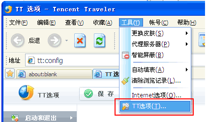 腾讯TT浏览器设置主页的方法: 1)首先,打开浏览器上部菜单栏的“工具”栏,在下拉列表中选择“TT选项”,如下图所示: